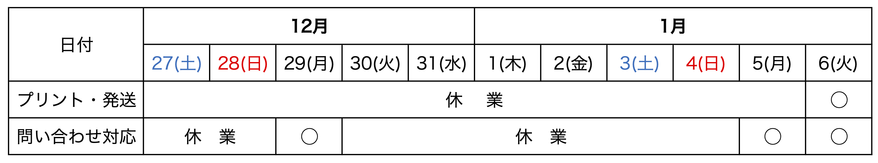 一部期間でプリント作業・発送作業・問い合わせ対応をお休みさせていただきます。